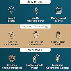 UPGRADED DUAL MODE - Our device combines forehead and ear measurements for double accuracy. Forehead mode offers indicative readings in 3 seconds, while ear measurements are medically accurate and instant. Ideal for various settings. EASY TO USE, FAST and Quiet - The DMT-77 thermometer boasts fast, one-button operation for easy measurement. Enjoy quick results within seconds, accompanied by a gentle vibration that won't disturb your sleeping child. THE ULTIMATE FAMILY THERMOMETER - The DMT-77 is ideal for all ages, be it a child, adult or the elderly. It’s designed for everyday use at home, a clinic or school. Easily switch between ℉ and ℃ according to your preference. BEST BABY THERMOMETER - With a large backlit screen, quiet vibration alerts, and an intelligent fever indicator that also warns for hypothermia, this thermometer is the best thermometer for infants.