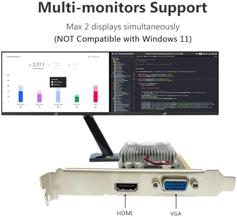 - PCI Express 2.0 interface,offers compatibility with a range of systems. Also includes VGA and HDMI outputs for expanded connectivity,supports up to 2 monitors.Good for adding a simple low profile gpu to a small form factor pc.