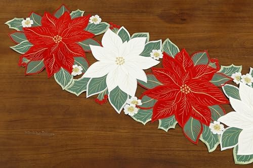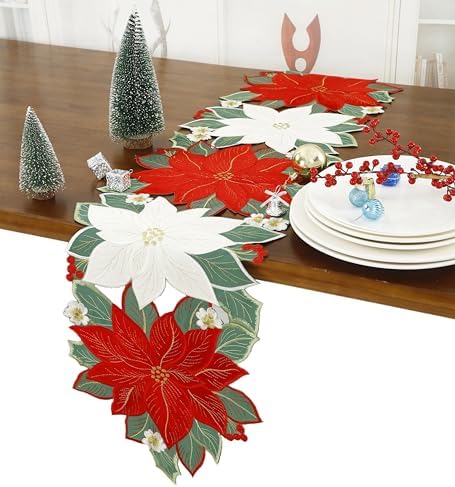 - 【Christmas Table Runner and Placemats】Exquisite applique embroidery Christmas red poinsettia and green leaf white Christmas flower table runner will add more festive atmosphere, and make your Christmas dinner more enjoyable. Perfect for the Christmas season to decorate your tabletop for holiday family gatherings.
