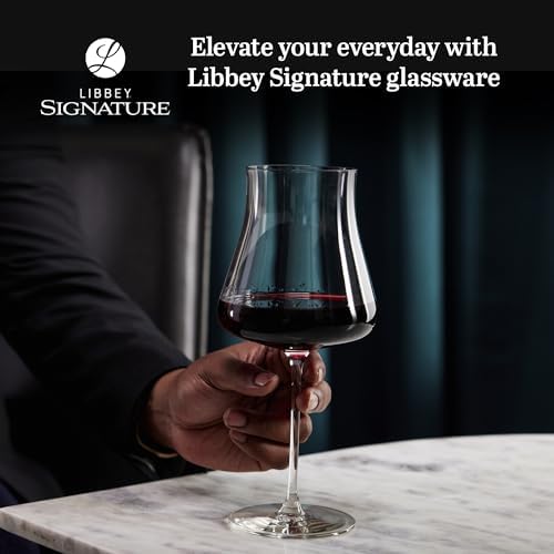Libbey Signature Stratford Set of 4 Wine Glasses: Our tall wine glasses are masterfully engineered to perfection for an exceptional wine-drinking experience. The gorgeous tall pulled, clear, high quality stem of our long stem wine glasses transitions seamlessly to the curved bowl, with flavor enhancing tapered rim while the flat foot provides stability. The aesthetic red wine glass set of 4 features thinner walls and a steadfast, stable foot that keeps it poised confidently on your tabletop. These versatile and elegant cabernet wine glasses comfortable design allows you to swirl effortlessly without worrying about spills; they serve as a refined choice for enjoying all varieties of wine. These Stratford Libbey wine glasses of the Libbey Signature collection are one of a kind stemware. Measuring 9.5” tall and 4.2” round, this modern wine glasses set is lead and BPA-free, ensuring a safe and enjoyable drinking experience. Effortless cleanup is guaranteed with our dishwasher-safe big wine glass set allowing you to spend more time enjoying the moment and less time on chores. The thoughtful design of our Stratford 24 Oz thin rim wine glasses makes them the perfect elegant wine glasses gift set for bachelorette parties, housewarmings, anniversaries, birthdays, cocktail parties and other special occasions, bringing an air of elegance to any celebration or casual get-together.