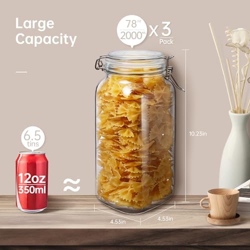 78oz - 3 Pack Square Glass Jars with Airtight Lid, Wide Mouth Mason Jars with Clamp Lids, Air Tight Glass Canisters, Best Food Storage Containers for Flour, Sugar, Cereal, Pasta, Rice, Coffee, Spice