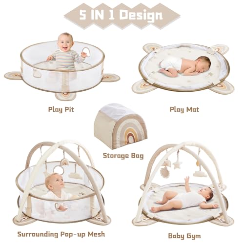 Beright 5-in-1 Baby Gym & Play Mat,Play Gym & Ball Pit with Sensory Toys for Newborn Infant Toddler to Develop Motor&Cognition, Balls Included, Rainbow
