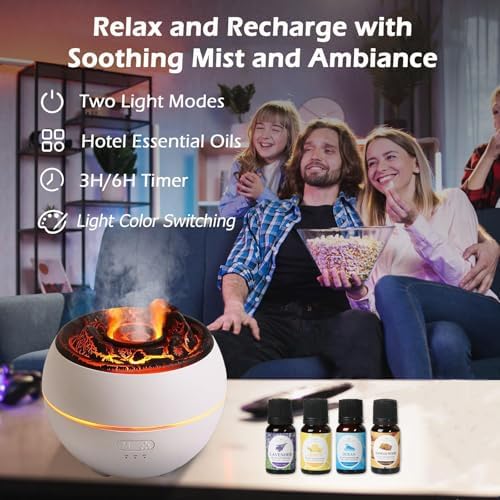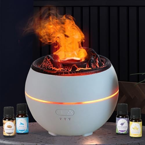 Volcano Essential Oil Diffuser, Volcano Flame Aromatherapy Diffuser, 7 Colors Fire Light & 4 Essential Oils, 360ml Auto-Off Cool Mist Ultrasonic Humidifier/Diffuser for Home Party Holiday