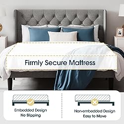 MODERN HEADBOARD: The bed frame's headboard features a button tufted wingback style design, covered in skin-friendly linen fabric and thickened sponge. It can perfectly match various styles of bedrooms STRONG CONSTRUCTION: The sturdy metal frame and cross construction improves the stability of the bed frame. Solid wood slats and 8 thickened metal feet can hold up to 800 LB UNDER-BED SPACE: The 6.3" under bed storage space can store some sundries for you, keep your room neat and organized and save space EASY TO INSTALL: All parts are labeled, support one person to finish the installation in about 30 minutes with the help of instructions and installation tools. No spring box is needed COMFORTABLE SLEEPING EXPERIENCE: Velcro and Silent Cotton design eliminates potential noise and brings you a peaceful sleeping experience all night long. Recommended 8-14 inches mattress