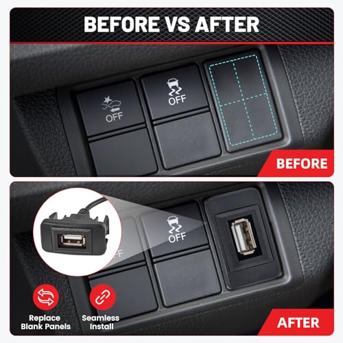 - Flush mount USB cable port: Play and play; Car square single port USB adapter uses existing holes or cut a hole in the dashboard and buckle the slots to slide and click right in the factory ports on the center console dash; Easy to install, ideal replacement for the old or broken one