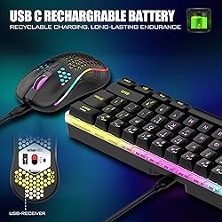 【High-performance 2.4G Wireless Keyboard and Mouse】Are you looking for a small wireless keyboard and mouseset to facilitate your work and gaming? RedThunder K62 rechargeable wireless gaming keyboard and mouse combo will be your best choice. 2.4G high-speed and stable transmission, ensure that it can easily deal with even the most intense battles. Note: The keyboard and mouse share a USB receiver in the bottom of the mouse. The keyboard has no 10-key numeric keypad. 【Rechargeable Keyboard and Mouse】The keyboard is equipped with a 1850 mAh battery, and the mouse is equipped with an 500 mAh battery. The long battery life allows you to use them continuously for 8 hours with light. The keyboard and mouse are equipped with smart energy-saving functions. If there is no operation within 2 minutes, they will automatically go to sleep, press any key to wake them up. To ensure transportation safety, the product is not fully charged, please use original cable to charge 8 hours via computer's USB port before using. 【60% Compact Small Keyboard and Ultra-light Honeycomb Shell Mouse】The most delicate and cute keyboard keeps your desktop neat, more space for mouse movement and other desktop devices. The well-designed perforated honeycomb shell mouse is ergonomically designed and weighs only 65 (+-5) grams, making it more flexible and comfortable without fatigue.The small keyboard and mouse combo will be the best choice for gamers. 【Light Up Keyboard and Mouse】60 percent rgb gaming keyboard features 4 RGB backlight modes, 4 levels of brightness adjustment, 7 monochrome backlight modes and 1 full rainbow backlight. The luminous design of Letters and gaps makes it the best light up wireless mini keyboard on the market. The mouse has a built-in 7-color cyclic gradual lighting effect(Note: The mouse scroll wheel lights up only when charging; it stays off when not charging). 【Durable Ergonomic Keyboard and Mouse】The keys have a 10 000 000 keystrokes lifetime, so you can hold on to it for the next decade! ABS keycaps adopt two-color injection molding process, the letter of characters never fade. The mouse fits the palm perfectly, and the anti-sweat and non-slip design gives you complete control. 【Plug and Play 】The keyboard and mouse share only one USB receiver, and the code has been completed by default. You only need to insert the receiver and turn on the keyboard and mouse to use it. (Note: If the receiver and the keyboard/mouse lose connection and cannot be used for any reason, you only need to reset the code pairing or contact us in time, we will try our best to solve it)
