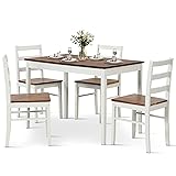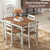 【Good Sturdiness & Durability】: Crafted with rubber wood legs, the rectangular dining table and dining chairs offer exceptional stability and resistance to deformation. The dining table can hold up to 220 lbs, while each dining chair boasts an impressive weight capacity of 331 lbs, providing a reliable and sturdy dining solution. 【Space-saving Design】: Featuring a smart space-saving design, this dinette table set allows the 4 chairs to conveniently tuck under the table when not in use, maximizing efficiency in your dining area and creating a tidy and organized space effortlessly, blending functionality with style seamlessly. 【Spacious Dining Set for 4】: This 5-piece dining table set comprises a large 45"x 28"dining table and 4 dining chairs, creating a cozy seating arrangement perfect for family meals or gatherings with friends, ensuring comfort and style for every dining experience. 【Wide Application】: With chic white finishes and natural wood grain, this farmhouse kitchen dining furniture enhances the ambiance of your dining room, kitchen, or restaurant, offering an inviting and cozy dining environment. The ladder backrest design adds a touch of style and elegance to elevate your dining space. 【Easy to Maintain】: The tabletop with waterproof and scratch-resistant acacia wood veneers ensures easy maintenance and long-lasting beauty for your dining set, simplifying cleaning tasks and preserving the pristine appearance effortlessly. The table dimensions are 45"x 28"x 30"(L x W x H), while the chair dimensions are 16"x 18"x 34"(L x W x H), providing ample space and comfort for a delightful dining experience.