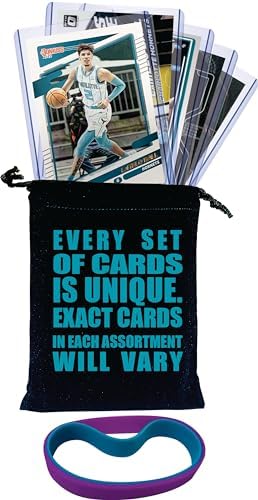 Grab this great lot of one of the top basketball players, LaMelo Ball! Guaranteed to contain 5 authentic, licensed basketball trading cards of LaMelo Ball. Exact assortment varies and could contain Charlotte Hornets uniforms. Each card comes in a protective sleeve and toploader case. The group comes in a gift bag with assorted color bracelets. Great for gift giving for collector's young and old.
