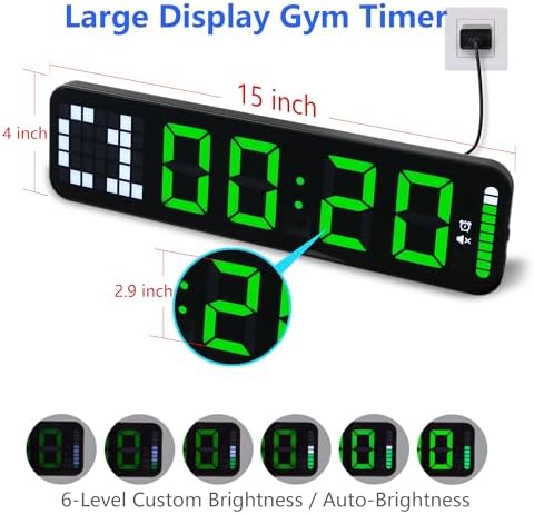 - 【15'' Large Display Gym Timer】 15*4 inch with 2.9 inch digits, 6 levels brightness dimmer, a built-in automatic dimming sensor,which auto-adjust brightness according to light changing, easy to read in home gym/garage/warehouse/outdoor
