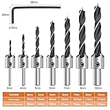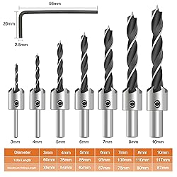 Excellent Performance: Countersink drill bit set for wood with tapered drill bit M2 HSS, 4 Flute countersink cutter for superior cutting power & durable Product Feature: Standard 1/4 inch hex shank is quick change compatible and has an adjustable counter sleeve depth with Allen wrench, for flush screw heads or deeper to cover with matching plugs Meet Your Demands: Include 3mm, 4mm, 5mm, 6mm, 7mm, 8mm, 10mm and 1 free Hex Key Wrench, 7 pieces different sizes of countersink drill bits, satisfy you all demand. The most often used sizes for cabinet, furniture makers and other wood working Multipurpose: The bits erfect for wooden planks, plastic, soft metals, fiber board, particle board, plywood, alumiumn board Quality Commitment: If for any reason you are not satisfied with your purchase, please contact us. We provide 30-day money back. 100% Satisfaction Guarantee for risk-free shopping