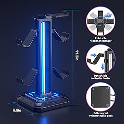 - Elevate your gaming setup with the KDD RGB Headset Stand, a versatile and stylish accessory designed to keep your headphones and controllers organized and within reach. This stand features 9 vibrant RGB light modes, including 7-color fast flashing, 7-color breathing, and single color options, creating an immersive gaming atmosphere. The detachable controller hook and rotatable headphone stand can accommodate various headphone sizes and multiple controllers, ensuring compatibility with a wide range of devices. Crafted with a stable base and protective rubber pads, this stand prevents tipping and safeguards your equipment from scratches and damage. Easy to install and portable, it's the perfect addition to any gaming desk, keeping your space clutter-free and your gaming essentials easily accessible.