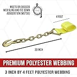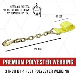 [SPECIFICATIONS] 3 inch wide by 4 feet long winch straps, with a large grab hook on one end. Breaking strength of 15,000 pounds and a working load limit of 5,000 pounds. Assembled and inspected in USA. [EXTRA LARGE GRAB HOOK AND CHAIN - 3/8”] Extra Large Hooks provide added strength to the overall strap. Construction is made to be durable and secure for all your tie down needs. [3” POLYESTER WEBBING] Using premium yellow polyester straps to ensure security and safety when strapping down your container. 4 feet in length so you will not have excess straps floating around. [RECOMMENDED USE] Used on trucks that roll on/off containers. Securing your container safely with Boxer Tool Straps, which are assembled in the USA. Chain and Hook ended for added strength and security. [DOT/CHP RATED] Following all standards to ensure safety and security on the road. Meeting all WTSDA safety standards with Boxer sewn in label.
