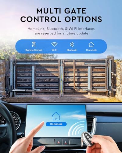 - Multi Gate Control & Mounting Options: These electric gate openers come with 2 remotes but support up to 32, along with HomeLink, Bluetooth, and Wi-Fi functionality (interfaces reserved) for ease of use. They securely mount inside or outside your gate or at various sides of the gate column.