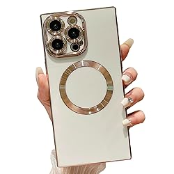 Omio Rectangle Case for iPhone 15 Pro Max Compatible with MagSafe, Luxury Plating Case for Women Girls Magnetic Cover with Rectangle Edges Soft TPU Silicone Full Body Shockproof Cover White
