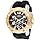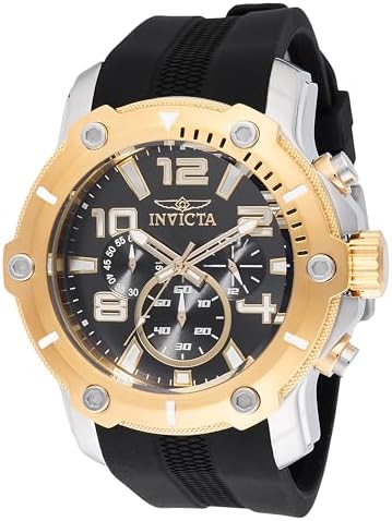 Black dial enhanced by gold-tone hands. Silver-tone stainless steel case with a black silicone band. Quartz movement. 100 meters / 330 feet water resistance. bezel. Flame Fusion crystal. Solid caseback. Buckle clasp. Pull / Push crown. Case size 51.5 mm. Band 26 mm x 8.50 incheslong. Invicta 45738 Pro Diver Watch.