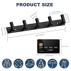 Dimensions: 15 x 1.57 x 1.96 inches VERSATILE USE: This Black Row Hook Coat Rack with 5 Hooks is suitable for various locations, including bathrooms, kitchens, living rooms, entrances, and offices. Use it to hang towels, kitchenware, coats, hats, jackets, wallets, keys, and more, adding functionality and organization to your space EXCLUSIVE ORIGINAL DESIGN: This rack comes with 5 modern-style wall hooks in our original design, protected by patent (29939860) ANTI SLIP AND SCTATCH RESISTANT: Each hook features thoughtful protrusions to prevent clothes and hats from slipping, and its smooth surface won't scratch towels, jackets, or coats OPTIMIZED HOOK SPACING: The row hook spacing is designed for efficient ventilation and drainage. The coat hook configuration is upgraded to accommodate smaller items effectively EASY INSTALLATION: Mounting this wall hat rack is a breeze, whether on a wall or wooden door. It includes all necessary mounting hardware, ensuring a hassle-free installation process