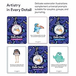Rediscover Genuine Connections: In a world of digital distractions, our Date Deck helps you reconnect through meaningful, face-to-face conversations. Ideal for anniversary gifts, bridal showers, and couples looking to deepen their bond. Celebrate Traditional Values: Each card is free from profanity and explicit content, designed to foster deep, spiritual connections. Perfect for family gatherings, community groups, and wholesome interactions. Strengthen Relationships: Whether you've been together for a few months or a lifetime, our prompts encourage conversations that build strength of character, mutual respect, and deeper understanding. Great for couples, friendships, and family dynamics. Family First Approach: Our Date Deck embodies pro-human, pro-marriage, and pro-family values. Spend quality time with loved ones, away from digital distractions. Rooted in faith and family, it’s perfect for all ages. Beautiful Watercolor Illustrations: Each card features a unique watercolor painting of a bird, adding a relatable human touch. Enjoy a laugh, share stories, and embrace our shared experiences with every card.