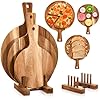 Hushee 3 Pcs Pizza Cutting Board Acacia Wood Cutting Board with Handle Round Chopping Board and Dish Rack Set Serving Platter Paddle and Plate Rack Stand for Cheese Bread Home Baking Fruits