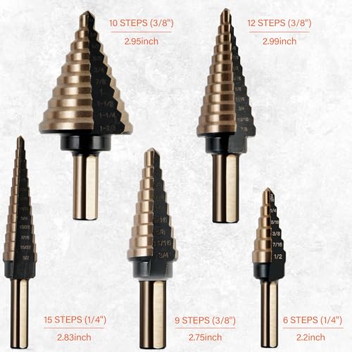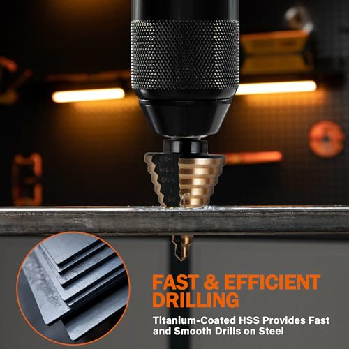 - HSS TITANIUM COATING: The step drill has excellent sharpness and durability due to its industrial high speed steel black and gold construction and titanium coating.