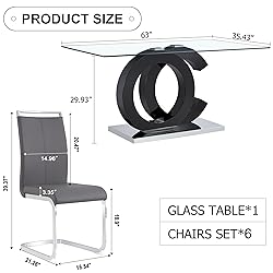 - Upgrade your dining experience with this Modern Glass Dining Table Set for 6. The set includes a stunning glass dining table and six comfortable faux leather dining chairs, combining modern design with classic comfort. The dining table is crafted with a high-quality tempered glass tabletop, providing a sleek and sophisticated look to your dining area. The 63-inch length offers ample space for family gatherings or dinner parties. The table features a durable and sturdy MDF board base with a modern design, ensuring stability and durability for years to come. The six dining chairs are upholstered in premium faux leather, offering both style and comfort. The ergonomically curved high backrest provides excellent support, while the cushioned seats are filled with soft padding, allowing you and your guests to sit back and relax during meals. The C-shaped chrome metal legs add a touch of elegance and provide additional stability. With dimensions of 63'' x 35.4'' x 29.9'' (DWH), the dining table offers plenty of space for you to enjoy meals with family and friends. The table can comfortably accommodate six people, making it ideal for family dinners or gatherings. Each chair measures 16.54'' x 21.26'' x 39.37'' (DWH) and has a weight capacity of 250 lbs, ensuring durability and stability. Assembly is a breeze with the included instructions and tools. The table and chairs are easy to clean, simply wipe them down with a damp cloth to maintain their pristine appearance.