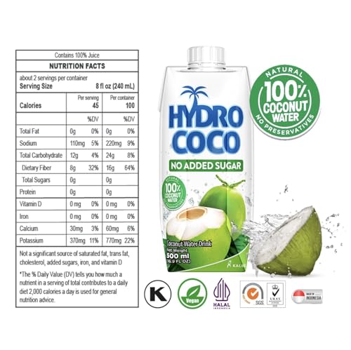 REAL TASTE OF COCONUT WATER | made with real coconuts. Hydro Coco is hand-picked from the plantation in Sumatra Island, Indonesia. NO ADDED SUGAR, NO ADDED WATER, FAT-FREE, GLUTEN-FREE, LOW CALORIE and NON-GMO — ONLY 45 calories per serving, Hydro Coco is the healthy drink for everyday refreshment and help lose weight. NATURAL HYDRATION | NATURAL ELECTROLYTES - Refresh your day with Hydro Coco, 100% coconut water, a healthy drink choice with full of minerals, potassium, magnesium and fibe