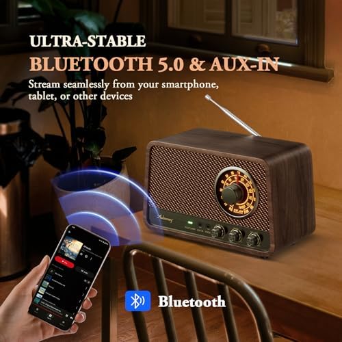 - 【Retro Bluetooth 5.0 Speaker & Aux Input】More than just a retro radio, it's a versatile retro Bluetooth speaker featuring Bluetooth 5.0 and Aux input. A dependable 5.0 Bluetooth technology allows you to stream your music from your phone to the radio speaker. .Auxiliary Input for Additional Audio Sources Like MP3 Player or iPod/iPhone.