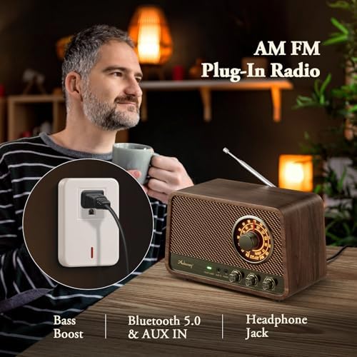Vintage Wooden AM FM Bluetooth Radio with Plug in Wall, Retro Bluetooth Speaker Radio with Aux in | Headphone Jack | Bass Control, for Home, Office, Kitchen