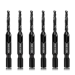 - Features1. Combination Drill & Taps Bit Set can be used to tap various threads to -including 6 SAE sizes: 8-32NC2. They are designed to drill, tap, deburr and counter holes on wood, copper, brass, aluminum, soft material metal sheet and plastic.3. Equipped with 1/4inch hex quick-change shank, they can work on Electric hand drill, impact drill, bench drill, electric screwdriver and other tap machines4. They are designed to drill tap a hole through the workpiece, not suitable for drilling Blind holes (it will break the bit in drilling workpiece thick than its work range). With bench drill, they can drill 3/16” (5mm) thick maximum; with hand drill, they can drill 1/8” (3mm) thick maximum.5. Advanced Black oxide coating technology give it rust prevention protection and classic appearanceUser GuideFollowing some technique will let you save the bit:1. Thin drill bits can break easily than thick bits, so drill more carefully while using a thinner drill bit, make sure it is perfectly straight.2. Before start drilling, use some cutting oil. It will not only allow to drill hole easily but keep the drill bit from snapping off. It will also keep the drill from getting overheated and damaged.3. Don’t push with much pressure since it can damage the drill bit.4. Slowly start drilling the intro surface and then gradually increase the speed. Drilling with high speed at starting point can cause slipping off.