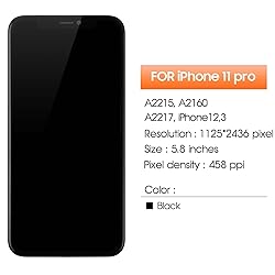 - -Compatible With:For iPhone 11 Pro Screen Replacement(No Face ID)-Model Number: A2215, A2160, A2217-Size:5.8 inches-Resolution:1125 x 2436 pixels【Please Note】▶ Correct installation requires special skills and techniques, you can go to the YouTube site to view the video to learn the installation method before trying▶ It is highly recommended to find a professional to perform the replacement. We may not be responsible for any damage caused during the replacement process▶ Unplug the battery connector and remove the battery before installation to avoid short circuit.▶ Before installing the LCD, remove all the old glue in case it affects the new glue paste.▶ If your case is in an unnatural state such as bent, please replace the case before replacing the LCD. Otherwise, the screen glass is likely to breakBefore confirming your purchase, please verify the model number of your own device, and the correct shipping address.If you find any problems after receiving screen, after learning the specific situation, we will immediately solve the problem for you and provide suitable and effective solutions.