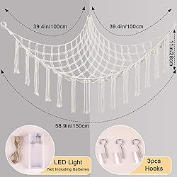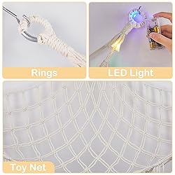 Stuffed Animals Hammock with LED Light: Our stuffed animals net or hammock is made of hand woven rope, and toy net with tassels, unique; Customized LED light with empty battery box, batteries are not included, prepare by yourself Large Capacity Stuffed Animals Storage: The size of the toy storage organizer is 39.4 x 39.4 x 58.9 inches and 51 x 51 x 65 inches, the tassels size is 11 inch, stuffed animals net can hold small or large size stuffed animals, as well as other toys or clothing; You can hang stuffed animals hammock in the corner, save the ground room and keep the room tidy Multipurpose Stuffed Animals Net: The stuffed animals holder can organize stuffed animals and other toys, such as stuffed animals, balls, blankets, pillows, clothes and other toys; Toy storage net, a variety of stuffed animals can be well displayed, and kids can pick their favorite toys at the first time Easy To Install: The package includes 1 pc stuffed animals hammock, 3 pcs anchors and 3 pcs screws, 1 pc 118 inches LED light with empty battery box, requires 2 AA batteries, not included; When the net is installed, you can pick the LED light and string it around the toy net, to avoid flipping over, keep the three hooks on the same level Creative and Fun for Kids: Kids can put all their favorite stuffed animals in the toy hammock, and each hammock for stuffed animals is individually equipped with a LED light string, kids can organize the string of lights according to their own ideas