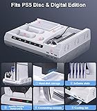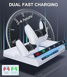 【New 2024 models】This PS5 Slim charging station is designed specifically for the latest PS5 Slim model in 2024, compatible with both disc and digital editions. It is a multifunctional PlayStation 5 Slim heatsink that combines storage, cooling, and fast charging functions. 【Innovative cooling system】This product features an innovative cooling design, equipped with a three-level adjustable cooling system that can quickly enhance air circulation at the bottom of the PS5 Slim, achieving efficient heat dissipation and ensuring that noise levels are kept to a minimum during 【Multi functional use】This multi-functional PS5 Slim cooling stand is capable of storing one PS5 Slim console, two PS5 controllers, five game slots, and one headset, while also being able to charge both controllers and the console simultaneously. 【Colorful LED lights】This PS5 Slim stand features built-in indicator lights that visually display the charging status of the console and controllers. A red light indicates charging in progress, while a green light indicates fully charged. 【After sales guarantee】We carefully inspected the goods before shipment to ensure the products work properly. You are entitled to a 90-day return and exchange service. If you encounter any issues during use, please contact us, and we will provide the best solution within 24 hours.