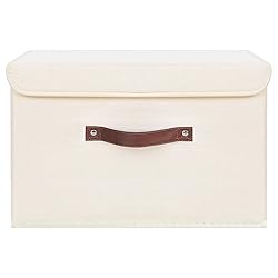 ANMINY Storage Bin with Lid Storage Boxes with PU Leather Handles PP Plastic Board Decorative Foldable Lidded Cotton Linen Fabric Home Cubes Baskets Closet Organizer Container - Beige, Large Size