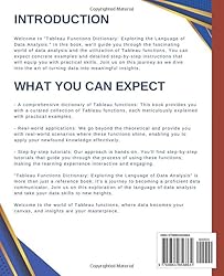 - Introduction Welcome to "Tableau Functions Dictionary: Exploring the Language of Data Analysis." In this book, we'll guide you through the fascinating world of data analysis and the utilization of Tableau functions. You can expect concrete examples and detailed step-by-step instructions that will equip you with practical skills. Join us on this journey as we dive into the art of turning data into meaningful insights. What You Can Expect - A comprehensive dictionary of Tableau functions: This book provides you with a curated collection of Tableau functions, each meticulously explained with practical examples. - Real-world applications: We go beyond the theoretical and provide you with real-world scenarios where these functions shine, enabling you to apply your newfound knowledge effectively. - Step-by-step tutorials: Our approach is hands-on. You'll find step-by-step tutorials that guide you through the process of using these functions, making the learning experience interactive and engaging. "Tableau Functions Dictionary: Exploring the Language of Data Analysis" is more than just a reference book; it's a journey to becoming a proficient data communicator. Join us on this exploration of the language of data analysis and take your data skills to new heights. Welcome to the world of Tableau functions, where data becomes your canvas, and insights are your masterpiece.
