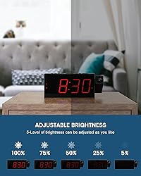 - A Multi-Function Projection Alarm Clock That Everyone Should Have One Which Can Make Your Getting Up Easier!Modern High-End DesignThis advanced alarm clock saves all your alarm settings when the power goes out. Plus, with time projection display, dual alarms, and a large LED display with dimming options, this is the only alarm clock you’ll ever need.180-Degree Swivel Projection Makes You See Time SimplyWith the 180-degree swivel projection when you wake up you just need to simply open your eyes to see the time on the ceiling, and no need to look at the clock display.USB Charging PortEquipped with USB charging ports, you can conveniently charge your devices bedside.5-levels Dimmable OptionsWith 5 levels of dimmable brightness, you can adjust the display to your preference, ensuring a peaceful night's sleep without any distracting glare.Dual Alarm to Wake You UpThe dual alarm function allows you to set two independent wake-up times, perfect for couples with different schedules. 7 Inches LED DisplayView the time easily and clearly with the large 7 inches backlit LED display. And the Bright Red LED means no squinting to read the time, even without your glasses.Battery Backup2*AAA 1.5V batteries (not included) are required for back-up. This clock's battery backup ensures its time setting is maintained and remain active even through power outages. Package Contents:1* Projection clock 1* US Plug1* User Manual2* Black Holders