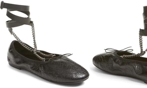 VALENTINO GARAVANI Rockstud Noir Black Ballet Ballerina Flat Shoes Size 38 These chic essentials are crafted of crackled calfskin leather in black and feature a simple bow at the toe and dark silver chain with black leather straps that wrap up around the ankle. MSRP: $795.00