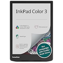 - Discover a new dimension of digital reading with the PocketBook InkPad Color 3 – the premium E ink reader designed for vivid storytelling, immersive visuals, and long-lasting comfort. With its advanced seven inch E Ink Kaleido 3 color display, this eye-friendly ereader brings comics, illustrated ebooks, and magazines to life, all while ensuring a glare-free, paper-like reading experience. The SMARTlight technology lets you adjust brightness and color temperature, and E Ink ComfortGaze makes every page easy on the eyes day or night. Carry your entire library anywhere with generous internal storage and OTG support for external memory. Whether you're a fan of novels, graphic books, or audiobooks, this versatile ebook reader supports over twenty e-book formats and six audio formats, no conversion required. Read and listen on your own terms. Built-in Text-to-speech in English and 25 other languages turns any ebook into an instant audiobook. Prefer listening? The integrated mono speaker and Bluetooth let you enjoy your favorite stories hands-free. The E-reader supports a wide range of e-book formats including EPUB, PDF, MOBI, CBR, and more, eliminating the need for file conversion. You can also view images in JPEG, PNG, BMP, and TIFF with crisp color and detail. For audio playback, it handles MP3 and OGG formats, while audiobook fans can enjoy titles in M4A, M4B, and MP3 ZIP for a seamless listening experience. Built for life on the go, the InkPad Color 3 is waterproof with IPX8 certification and lasts up to a month on a single charge. Its dual-band Wi-Fi ensures smooth connectivity, while preinstalled apps like music player, Sudoku, and dictionary add smart functionality beyond reading. Whether you're relaxing by the pool, commuting with an audiobook, or diving into a color-rich graphic novel, this lightweight ebook reader offers a seamless blend of performance, portability, and personalization.