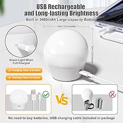 【 E26 Rechargeable Light Bulb with Detachable Magnetic Base 】- With a built-in upgraded high-capacity 2000mAh battery, the rechargeable LED light bulb is great for those places in the home that need light but have no hardwiring or power outlets available, such as wall sconces and lamps in the living room, bedroom or kitchen. With a magnetic base design, the bulb is easy to install since you can just screw it in and then attach the bulb afterward since they’re magnetic. It’s also super easy to charge. The magnetic base that stays screwed into the bulb socket, just pulls off the top to recharge. No need to screw and unscrew a light bulb multiple times. 【 LED Light Bulb with Remote Control, Dimmer and Timer 】- Operation is simple with the included remote control that allows you to turn the lights on and off quickly, adjust brightness and warmth, select from 3 lighting colors ( Warm White / Natural White / Cold White ) and set a timer ( 15 min / 30 min / 60 min / 120 min ) across the space with a 10-meter-long working range. It is convenient if the LED bulbs are set up in a hard-to-reach location 【 Rechargeable Night Light Bulb 】- This battery backup night light bulb of 7W produces a living-space-friendly 700 lumens of brightness, equivalent to a 40-watt incandescent. You can select from warm white, natural white, and cold white. It also has a memory mode, which allows the bulb to turn on to its last-used lighting automatically. You can charge this bulb with the provided Type-C USB cable. Charging to full takes 4-6 hours, and running lasts 6-9 hours 【 More Than an LED Bulb - 3 Ways to Use 】- With 3M sticky adhesive and an additional lanyard base, the rechargeable LED Light Bulb is more than just a regular light bulb for a lamp or pendant light. You can stick it in the cupboard, wardrobe and closet. Or you can use it as an outdoor ten light enabling you to explore outdoor adventures like camping, fishing, hiking, etc. It’s also a practical small night light that lets you enjoy bedtime 【 Lanyard Included for Wider Uses 】- Paired with 3M sticky adhesive, detachable magnetic base and an additional base with Lanyard, the battery backup light bulb with easy-to-hang design is perfect for a pantry, closet, camping tent, camper, canopy, chicken coop, goat shed, kitchen cupboard, wall sconce, lantern, outdoor bathroom ( tower rack, shower rod ), entryway, camping, farmhouse, garage, barn, travel, etc.