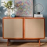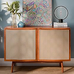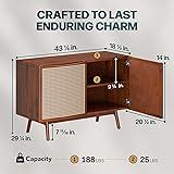 ELEGANT MID CENTURY CABINET: This curved buffet cabinet is adorned with inlaid rattan for a sensation of softness; Whether placed in a living room, dining room, or even a hallway, this accent cabinet exudes an undeniable allure DESIGNED FOR CONVENIENCE: This entryway table with storage features soft close doors with aesthetic smiley handles that operate smoothly and silently; The adjustable shelf of our sideboard allows you to customize your storage DURABLE MATERIALS: The mid century cabinet showcases a solid acacia frame, legs, and MDF backboard that exude unparalleled durability; This sideboard is also adorned with plastic rattan to capture both style and functionality VERSATILE MODERN BUFFET CABINET: This storage cabinet with doors gracefully blends into any setting, ready to serve as an ideal sideboard, bookcase, or cupboard to enrich your living environment EASY TO ASSEMBLE CABINET WITH DOORS: Our console table for entryway comes with all of the parts, tools, and instructions for a better assembly experience, saving you time; An anti-tip kit is also included for added protection