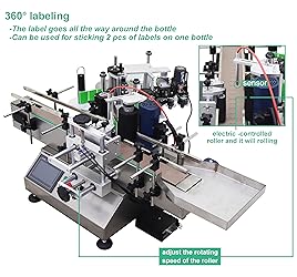 【Application】This automatic round bottle labeling machine is used for bottles with the diameter of 0.78-4.72in(2-12cm). It can complete 360°labeling. The machine also can be used for sticking 2 pcs of labels on one bottle. The machine is widely used in food, cosmetics, hardware and other industries. It adopts high-precision and high-speed labeling device and can save a lot of manpower, improve labeling accuracy and consistency. 【Labeling Height Adjustable】The height of labeling can be adjusted according to the height of different bottles. The height of the label should be within 0.98-5.9in(2.5-15cm) and the length of the label should be within 0.98-13.78in(2.5-35cm). 【With Printer】The Automatic Round Bottle Labeling Machine is equipped with a code printer, it can print the date or the batch number directly while the labeling is proceeding. It can print Arabic numbers and English letters, including 9 letters: exp, lot, mfg. 【Labeling Precisely and Stably】Automatic photoelectric tracking sensors makes sure precise labeling. It also has label automatic detection function to prevent missing labels and label waste. The machine is made of stainless steel and high-grade aluminum alloy. The three-bar adjustment mechanism makes full use of the stability of the triangle, making the whole machine solid and durable. 【With 3 motors】The labeling machine has 3 motors. One for controlling the label roll, one for controlling the roller of labeling and one for the conveyor. The machine also needs to be connected to an air compressor.