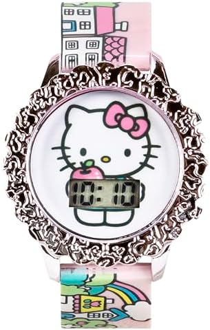 Add a touch of magic to every moment with the Sanrio Hello Kitty Kids Flashing LCD Watch! Designed for young Hello Kitty lovers, this delightful timepiece features a vibrant pink cityscape-printed strap and an adorable character dial with the signature Hello Kitty bow. The decorative bezel enhances the charm of the watch, while the flashing LED light function adds an interactive element that kids will love. Simply press the button to activate the flashing lights, making time-checking extra fun! The easy-to-read digital LCD display ensures that kids can tell time effortlessly, making it ideal for beginners. With an adjustable strap designed to fit wrist sizes from 5.5” to 8”, this watch guarantees a comfortable and secure fit for growing children. The lightweight, durable plastic case and strap make it suitable for daily wear, whether at school, playdates, or special occasions. Packaged in a stylish and collectible box, this Hello Kitty LCD watch makes a fantastic gift for birthdays, holidays, or any special occasion. Let your little one celebrate their love for Hello Kitty while learning time management in the most adorable way possible!