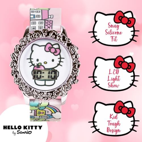 Sanrio Hello Kitty Kids Flashing LCD Watch – Pink Cityscape Strap, Decorative Bezel, Digital Display, Light-Up Feature, Adjustable Fit, Adorable Design, Great Gift for Girls – Fits Wrists 5.5” to 8”