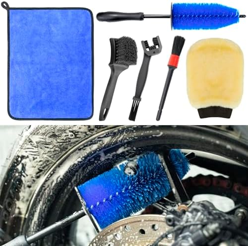- [6 Pieces Motorcycle Cleaning Set]: Includes motorcycle easy reach brush,chain brush,wool wash mitt,stiff tire brush,detailing brush and microfiber towel for effective and thorough motorcycle cleaning and maintenance.