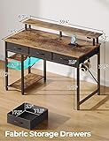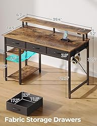 Computer Desk with Power Outlet: The Computer Desk is equipped with a built-in power strip with 2 outlets, 2 USB Ports & 1 Type C, which provides convenience for charging your gaming gear, tablet, printer or phone. Don't worry about not having enough power sockets Gaming Desk with Multifunctional LED: Enjoy the gaming desk with vibrant multi-color RGB LED light strips. 60,000 colors controlled by the Phone App or controller enables you customize brightness, color, mode, and timer settings. The LED lights also sync with music, creating a romantic and energetic atmosphere for gaming Large Storage Capacity Desk with 3 Drawers: This desk is designed with 3 easy to assemble fabric drawers that gives a nice amount of storage for everything else you need during your work day or study day. The 3 storage drawers can stash things away, perfect for organizing your documents, office or school supplies, gaming equipment etc. You will always have an organized desktop All-in-one Versatility Computer Desk: The desktop size (39 inch*20 inch) fits your laptop, books and 3 large capacity fabric drawers (each drawer can support up to 8 lb, about 2 laptops). Ample room for all of your office or work- from-home needs. The two lower shelves on the side allows you to organize paperwork and keep your area clutter-free. The monitor stand allows you to sit correctly while working, so that you can have a healthy cervical spine to stay productive while working at home Sturdy & Attractive Table: The metal leg and wood desktop together makes this desk a tank in the desk world. This construction design keeps your table be no wobble while typing, writing or gaming. Even serving as your office desk, study writing table, gaming desk. The morden desk design also matches the rest of your furniture. You can enjoy sturdy and fashion design all in one desk Frame Made of FSC-Certified Wood