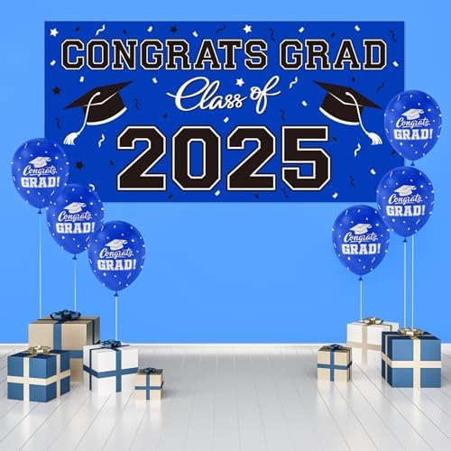 - Celebrate in Style: Make your graduation decorations stand out with our "Congrats Grad 2025 " banner. Measuring an impressive 65" x 32.7", this vibrant Blue banner adorned with stars, graduation caps, and confetti is the backdrop for your Class of 2025 celebration.
