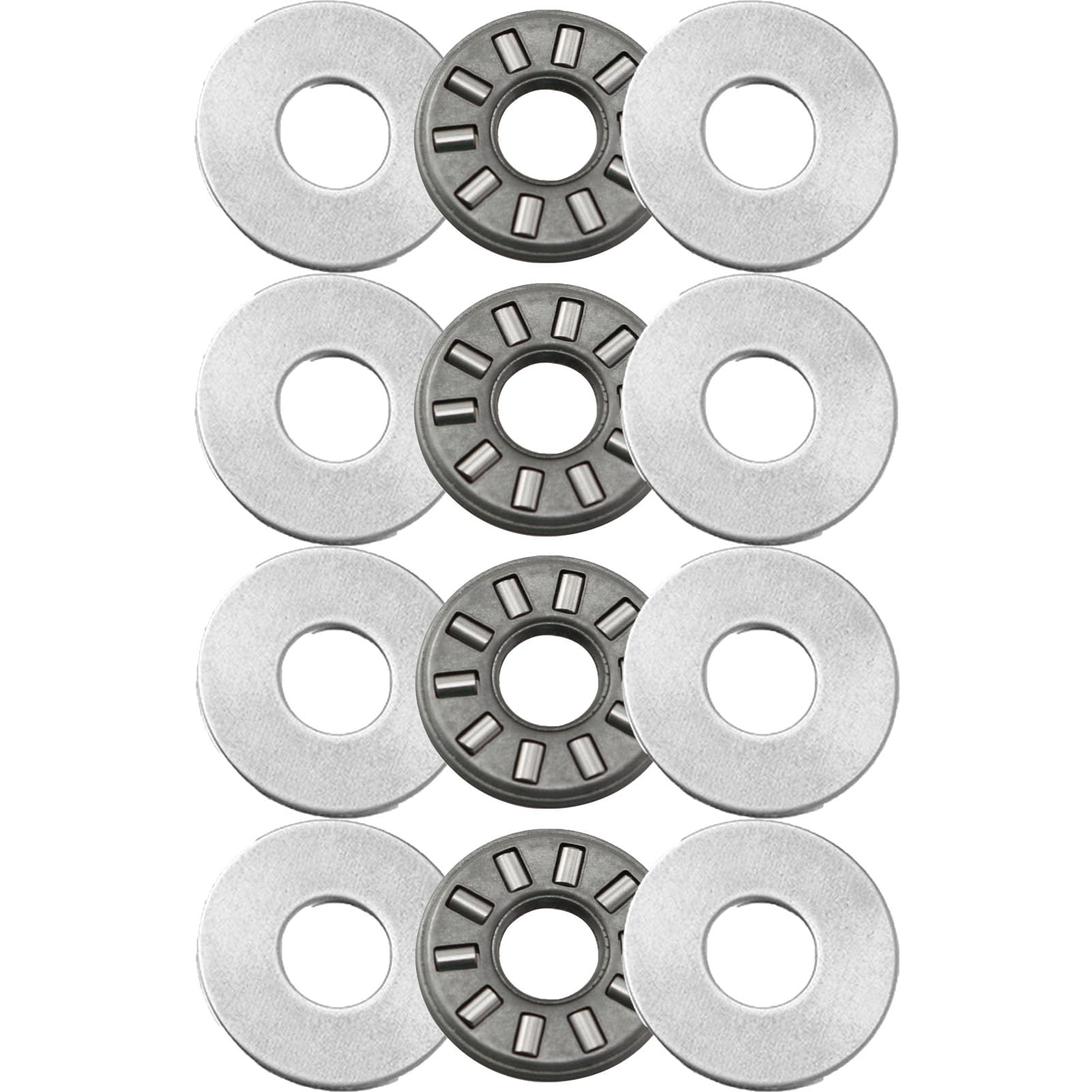 [Model] Bearing Model: NTA1220 (Bore diameter: 3/4", Outer diameter: 1-1/4", Thickness: 5/64"). Washer Model: TRA1220. [Package Contents] 4 x Bearings, 8 x Bearing Washers. Rollers are made of high-temperature bearing chromium steel for heat resistance and durability under heavy loads. [Features] The needle roller thrust bearings are capable of supporting axial loads in a single direction only. [Capability] Thrust needle roller bearings have a smaller cross-section and can be used in tight spaces compared to standard thrust bearings. There are four sizes of bearings to choose from, which can fulfill most of the daily needs in areas such as agricultural machinery, automobiles, mechanical engineering, power generation, metallurgy and textiles. [Best Service] We provide you with high quality products and service at the best price. If there is a quality or size problem within 30 days, please feel free to contact us and we will always help you with refund or exchange.