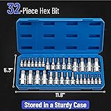 - Bates hex bit socket set includes 32 pieces with 1/4", 3/8", and 1/2" drives, providing a comprehensive range of sizes for both standard SAE and metric measurements to accommodate various fastening tasks.Crafted from S2 steel, the machined bits in this set offer superior hardness and torque capacity, which enhances durability and ensures long-lasting performance under rigorous use.Each bit and socket is precisely machined to provide a perfect fit with fasteners, reducing the chance of stripping or damaging bolts and nuts during application.Ideal for automotive repairs, machinery, HVAC installations, and DIY projects, this set provides the necessary versatility and size options to handle a wide array of tasks efficiently.Comes in a sturdy, organized blue case that keeps all the sockets neatly arranged and easily accessible. This case is durable enough to withstand the rigors of a professional workshop or garage.