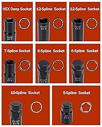 - NOTICE: 1.Total of 8 socket keys(According to the different inner diameters are divided into 5-Spline 3/4" | 6-Spline 41/64" | 6-Spline 45/64" | 7-Spline 3/4" | 10-Spline 23/32" | 12-Spline 11/16" | 12-Spline 13/16" | Hex-SAE 19MM). 7 of the socket keys are used to remove or tighten spline lug nuts and 1 socket key is used to remove or tighten spike lug nuts. 2.Lug Nut Socket key is rugged and durable. Made of heat-treated CR-V steel for greater strength and longer service life. Not susceptible to rust and corrosion 3.Add the lug nut removal tool to your wheel repair tools and it will help you to remove and install wheel lug nuts like a professional. Easy to use at home at any time for convenience. SPECIFICATION: Thread Size: M14X1.5, M12X1.5, 1/2-20, 9/16-18, M12X1.25 Color:Black Quantity:8pcs Material:CR-MO Fitment: 5-Spline 3/4" 6-Spline 41/64" 6-Spline 45/64" 7-Spline 3/4" 10-Spline 23/32" 12-Spline 11/16" 12-Spline 13/16" Hex SAE 19MM