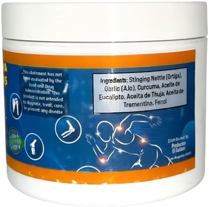 This alternative natural gel made from natural ingredients, stinging nettle(ortiga), garlic (ajo), Curcumin(curcuma), Eucalyptus Oil, Thuja Oil (pine oil), Turpentine Oil (trementina) and phelo.