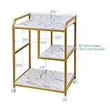 【Large Size with Tons of Storage Space】Enlarged tabletop 22"W x 18"D offers ample space for holding large and heavy printer, scanner and other bulky machinery. Spacious computer tower slot with internal size 23.6"H x 10.6"W x 18.9"D can accomodate most PC cases and is also ideal for paper shredders. The unique middle floating shelf is a pleasing addition to keep your books, printing paper, toner and other office supplies organized, and it can be reversed with the computer tower slot according to your needs. 【Sturdy and Heavy Duty】Each shelf of this printer stand is supported by the robust steel tube underneath rather than simply screwed into the side frame, contributing to a solid construction and exceptional load capacity. High quality particle board with water- and wear-resistant surface and strong powder-coated steel tube frame makes it quite a durable stand table that you can count on for years. 【Smooth Modern Appearance】The bright faux white marble shelf combined with stylish streamlined golden framework outlines the endless beauty of modernism, making it an appealing home office furniture, which stands apart from many other alternatives in the market. 【Multi-Functional】It's definitely more than just a printer stand, a computer host stand, a paper shredder stand for your office organization. It's also an end table next to your sofa in the living room, a night table accompanying your bedtime in the bedroom, a fish tank stand or even a mini fridge stand with extra storage by your side. 【Both the Feet and Casters Included】The package comes with both adjustable feet and rolling casters so that you can either keep the stand stationary with the feet and enjoy the full stability or mount the casters to move the stand around flexibly and enjoy the mobility. 2 of the 4 wheels are lockable to keep the cart in position. 【Easy Assembly】Assembly becomes interesting and fulfilling when you open the package seeing the straightforward instructions, the flawless parts packaged neatly and numbered clearly, well aligned holes coming with nice anchors to accept the screws, a spare piece for each type of screw included in case one goes missing, and a full set of installation tool provided for easy assembly.