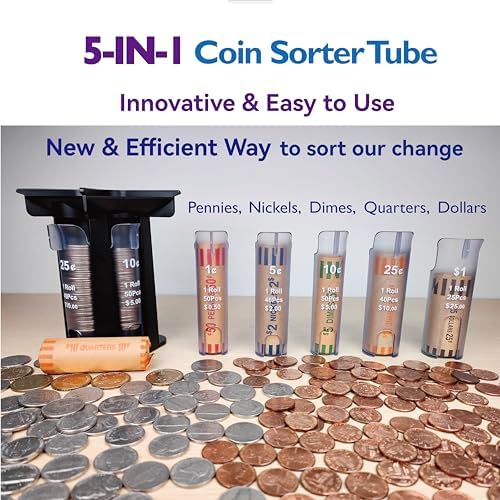 - 1. New & Effective 5-IN-1 Coin Sorter Tube: This New & Effective Coin Counter & Coin Sorter Tube includes Pennies, Nickels, Dimes, Quarters and Dollars. No More Separated 5 Coin Tubes like others. Great Helper for your life and work!